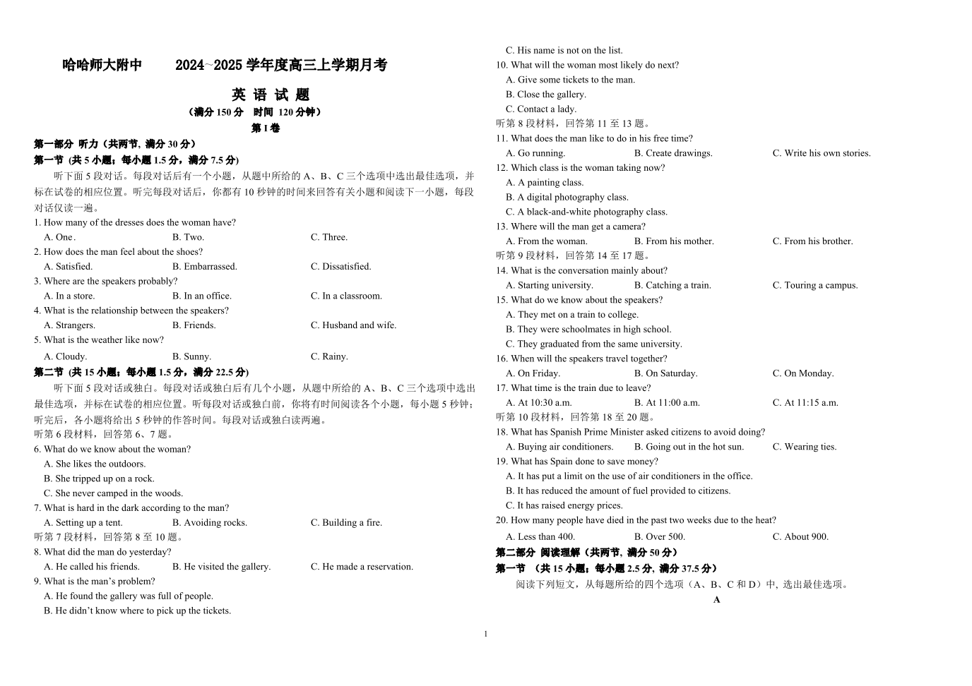 黑龙江省哈尔滨师范大学附属中学2024-2025学年高三上学期10月月考 英语