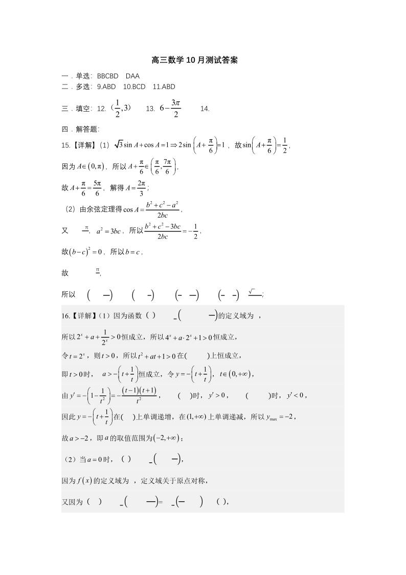 黑龙江省哈尔滨师范大学附属中学2024-2025学年高三上学期10月月考 数学答案
