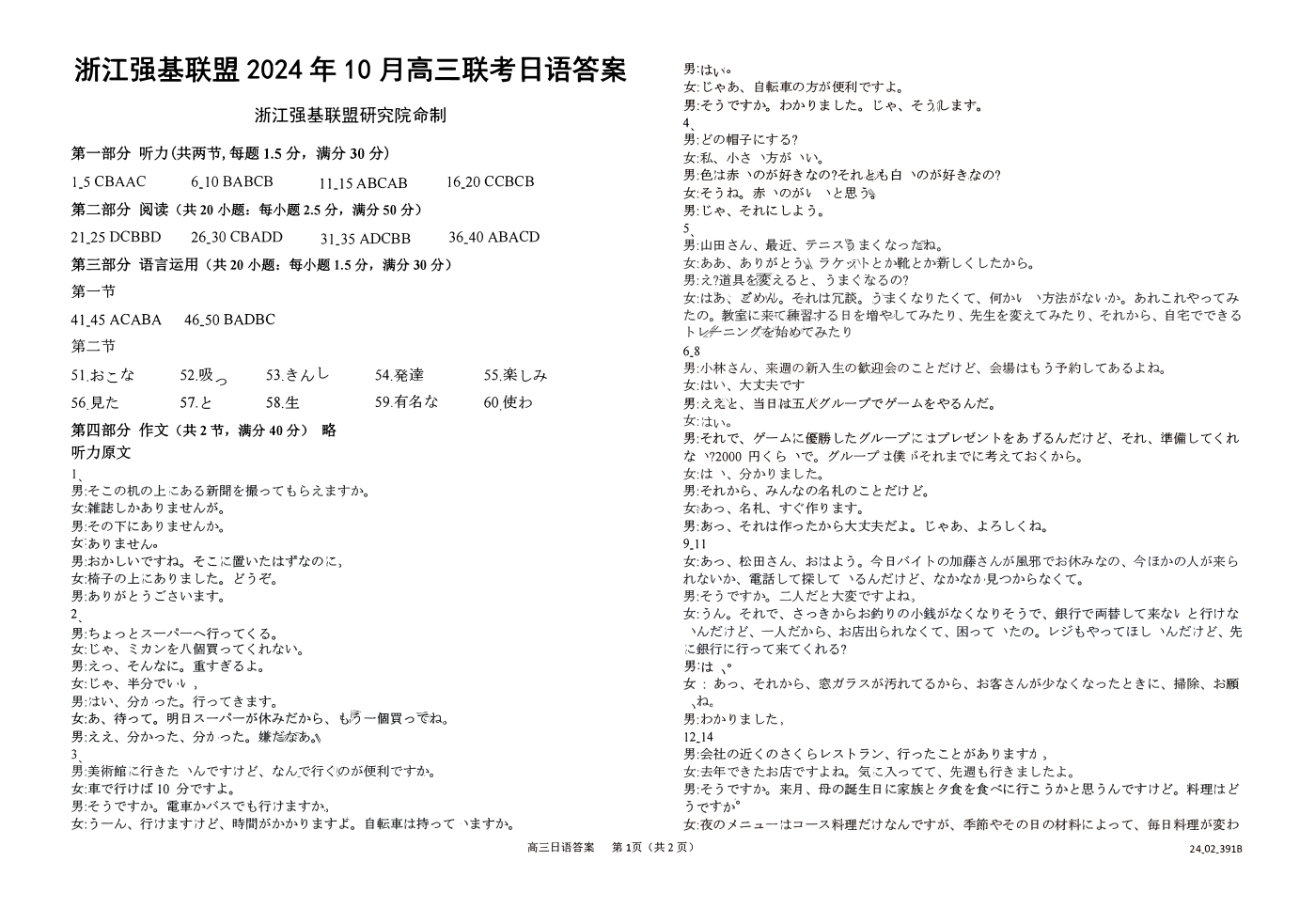 日语答案-2410高三强基联盟