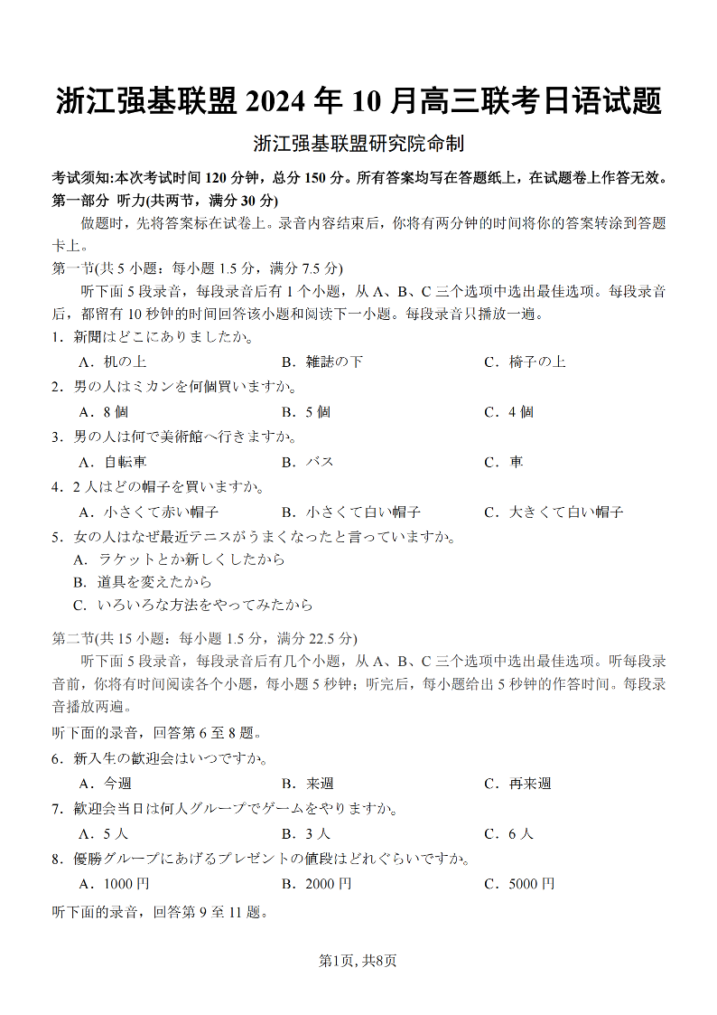 日语卷-2410高三强基联盟