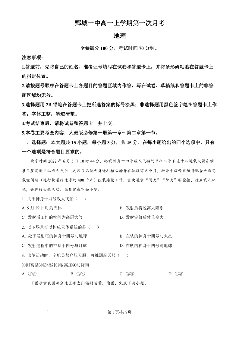 山东省鄄城一中2024-2025学年高一上期第一次月考 地理