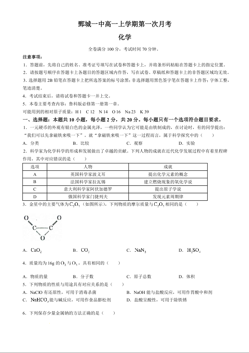 山东省鄄城一中2024-2025学年高一上期第一次月考 化学