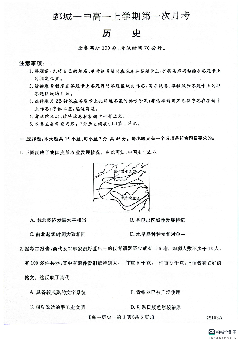 山东省鄄城一中2024-2025学年高一上期第一次月考 历史