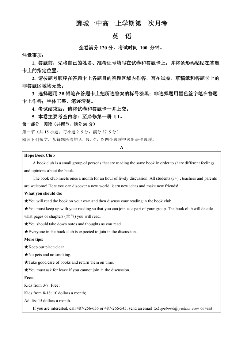 山东省鄄城一中2024-2025学年高一上期第一次月考 英语