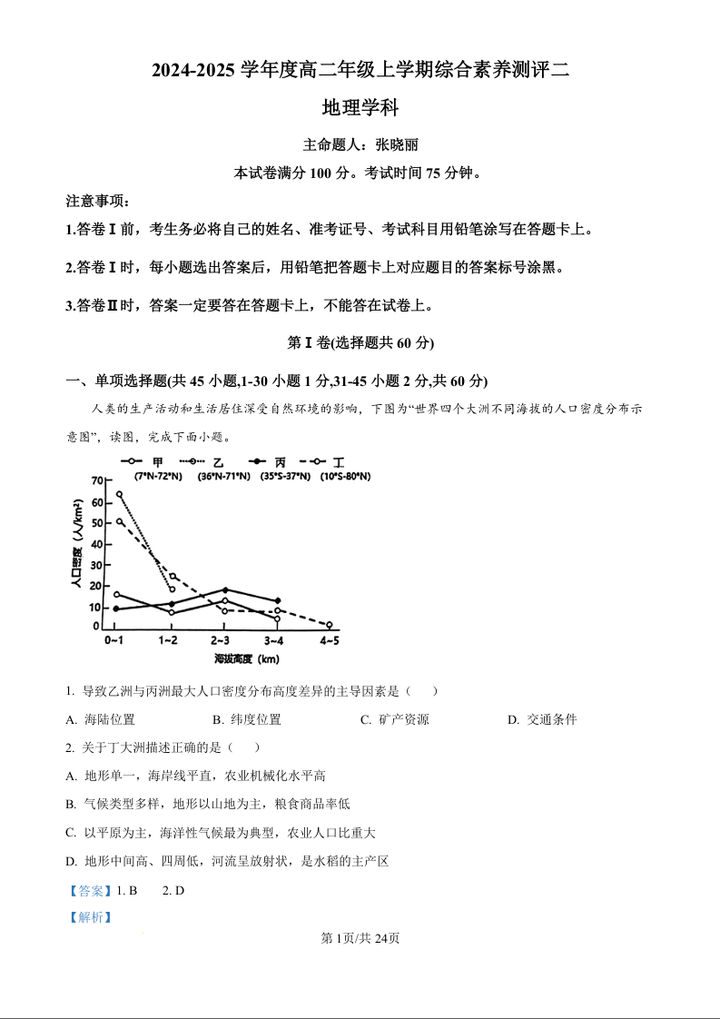 河北衡水中学2024-2025学年高二上学期综合素质评价 地理答案