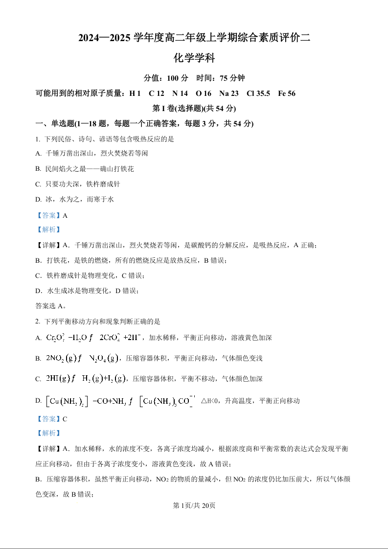 河北衡水中学2024-2025学年高二上学期综合素质评价 化学答案
