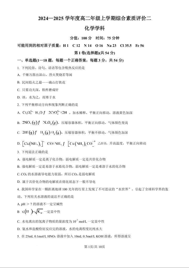 河北衡水中学2024-2025学年高二上学期综合素质评价 化学