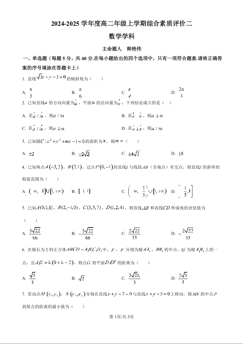 河北衡水中学2024-2025学年高二上学期综合素质评价 数学
