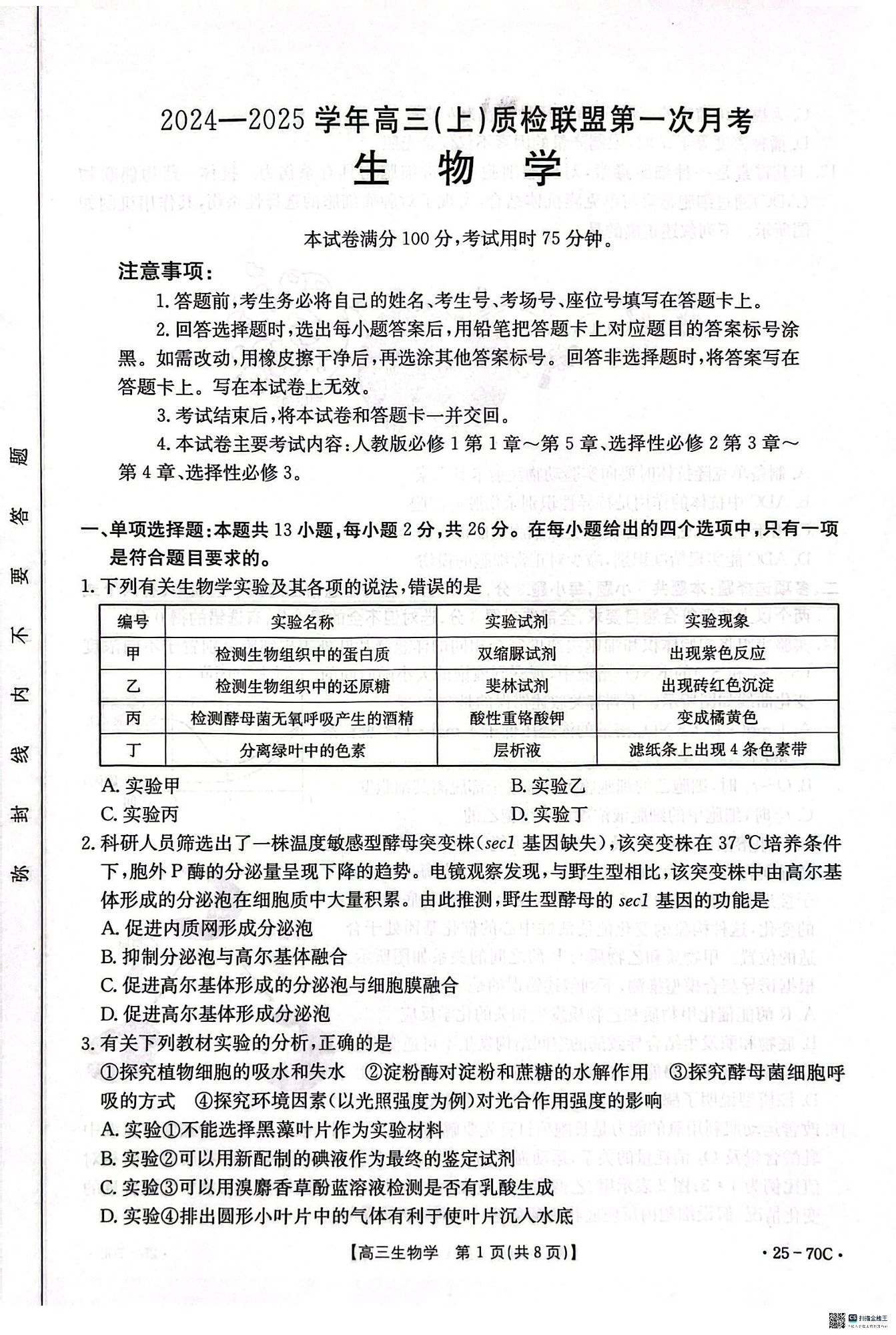 河北省邢台市质检联盟2024-2025学年高三上学期10月月考 生物