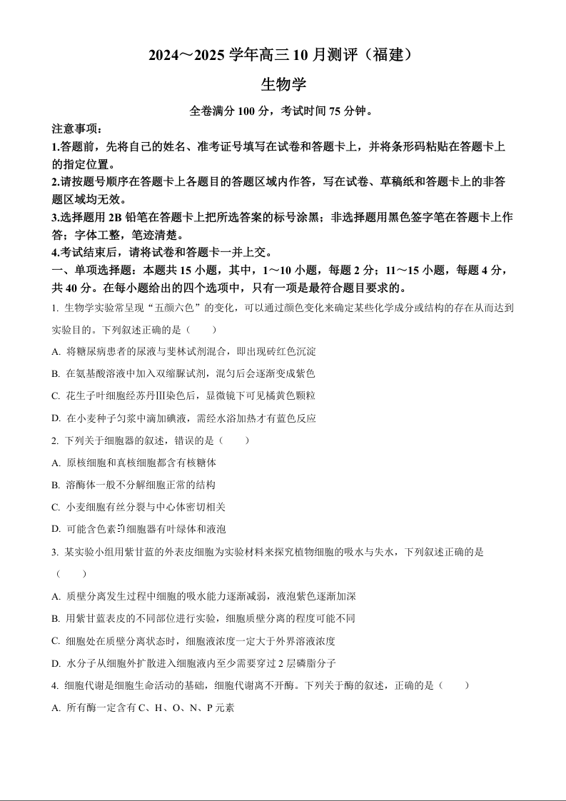 福建省百校联考2024-2025学年高三上学期10月测评 生物