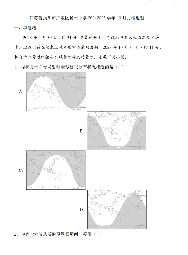 江苏省扬州中学2025届高三上期10月月考 地理