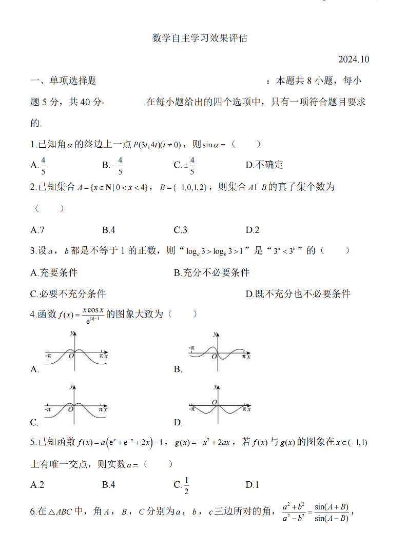 江苏省扬州中学2025届高三上期10月月考 数学