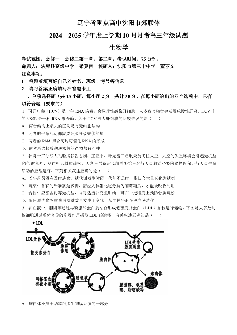 辽宁省重点高中沈阳市郊联体2024-2025学年高三上学期10月月考 生物