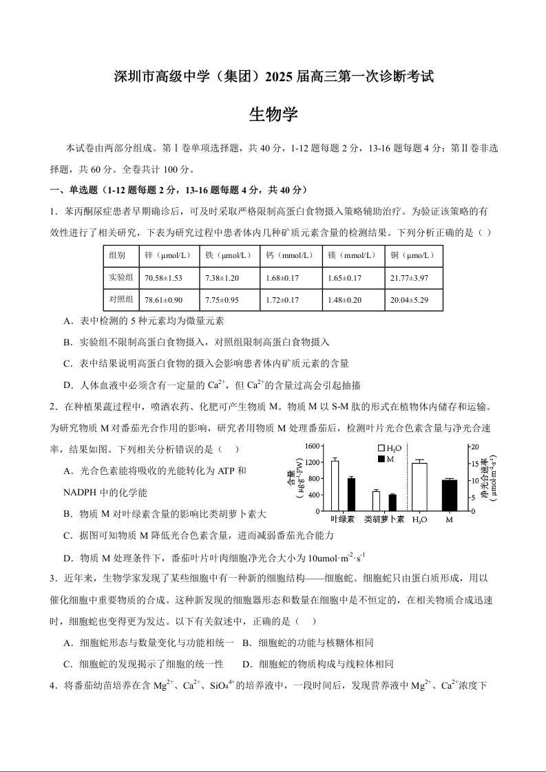 深圳市高级中学(集团)2025届高三第一次诊断考试 生物