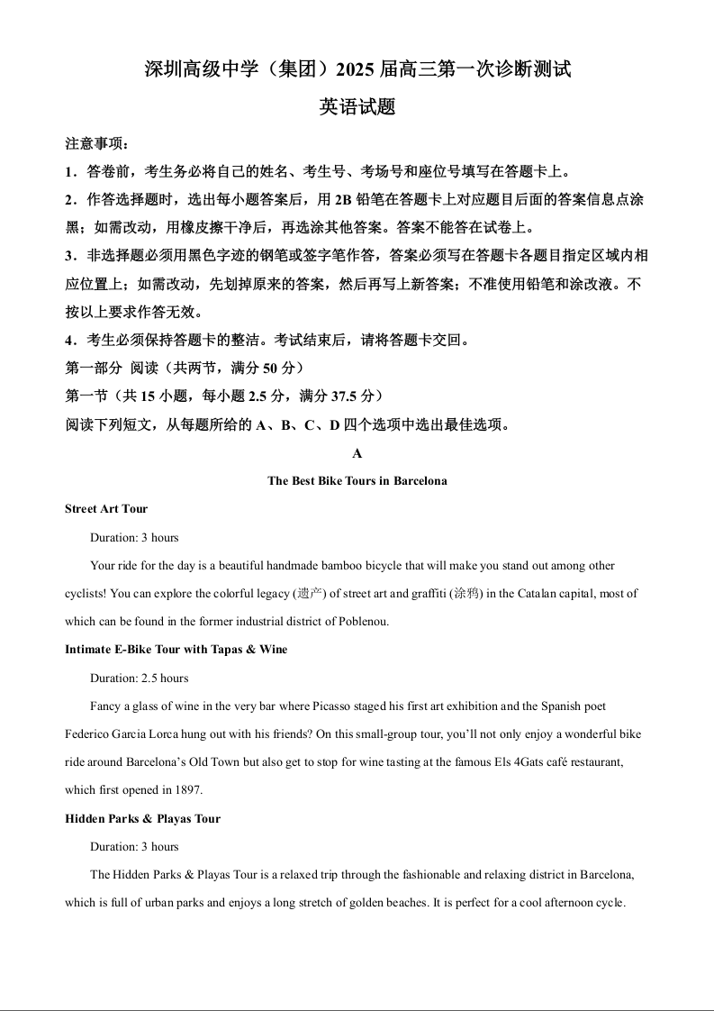 深圳市高级中学(集团)2025届高三第一次诊断考试 英语