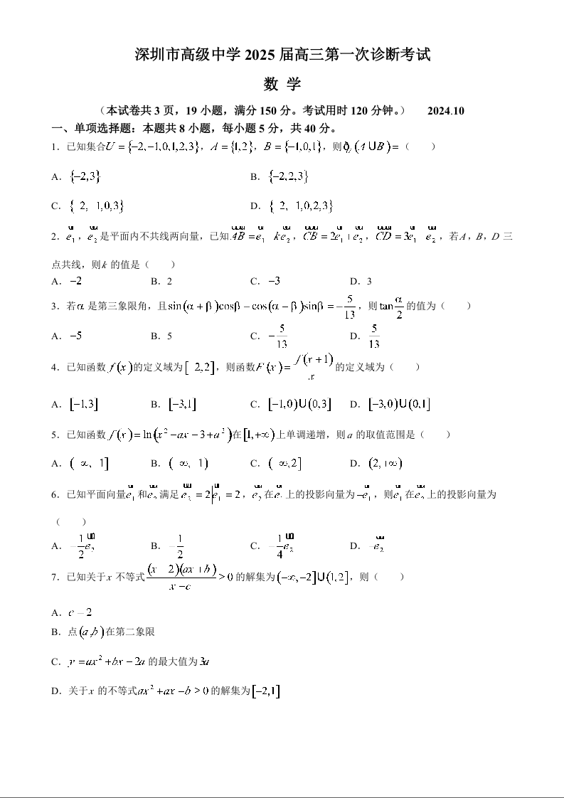 深圳市高级中学(集团)2025届高三第一次诊断考试 数学