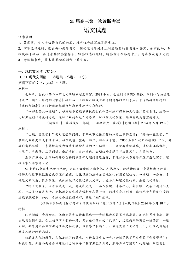 深圳市高级中学(集团)2025届高三第一次诊断考试 语文