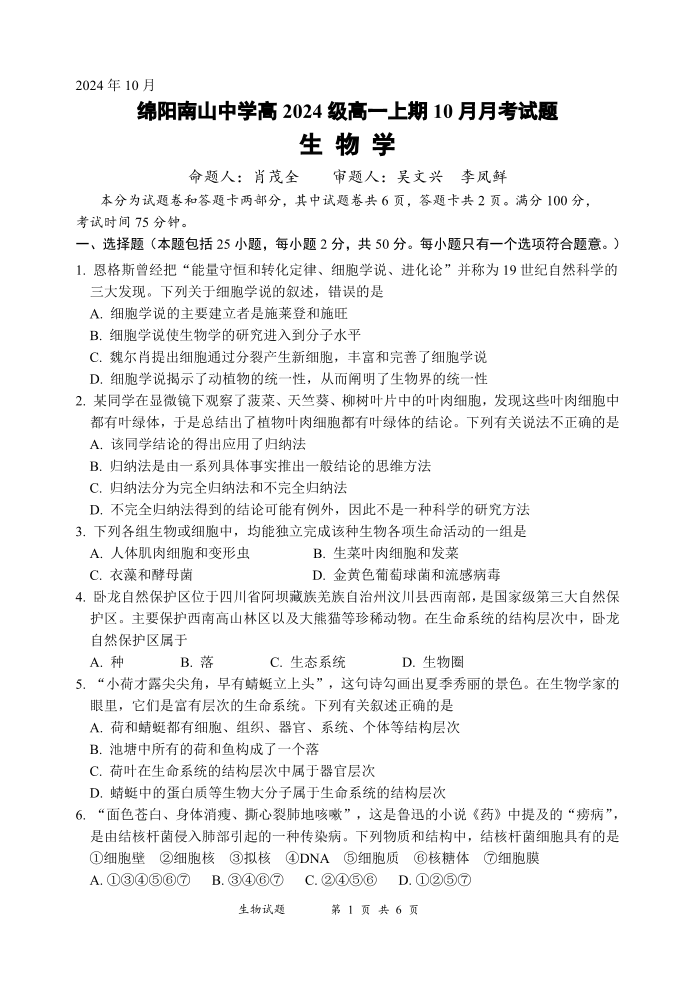 四川省绵阳南山中学高2024级高一上学期10月月考 生物