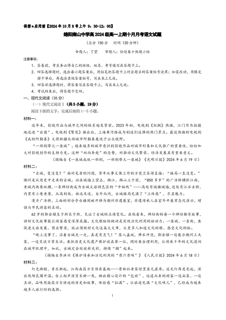 四川省绵阳南山中学高2024级高一上学期10月月考 语文