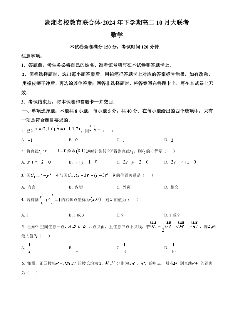 湖湘名校教育联合体2024年下学期高二10月大联考 数学