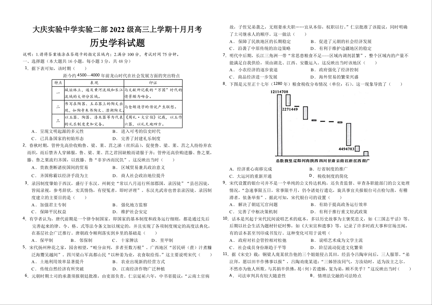 黑龙江省大庆市实验中学实验二部2024-2025学年高三上学期10月考试 历史