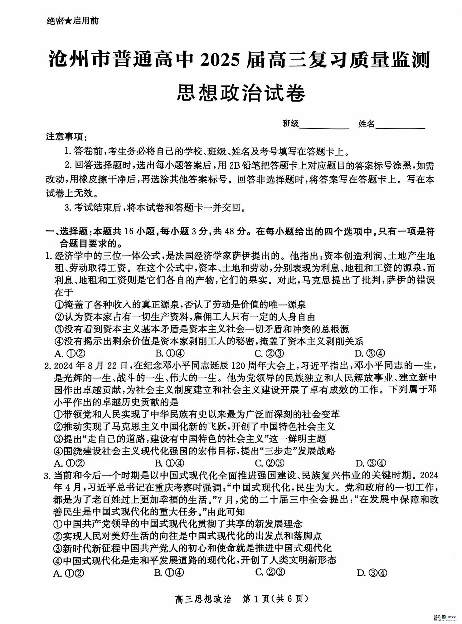 河北省沧州市2025届高三10月复习质量监测 政治