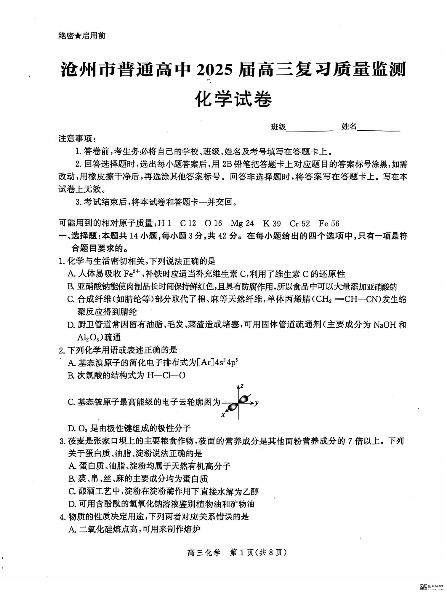 河北省沧州市2025届高三10月复习质量监测 化学
