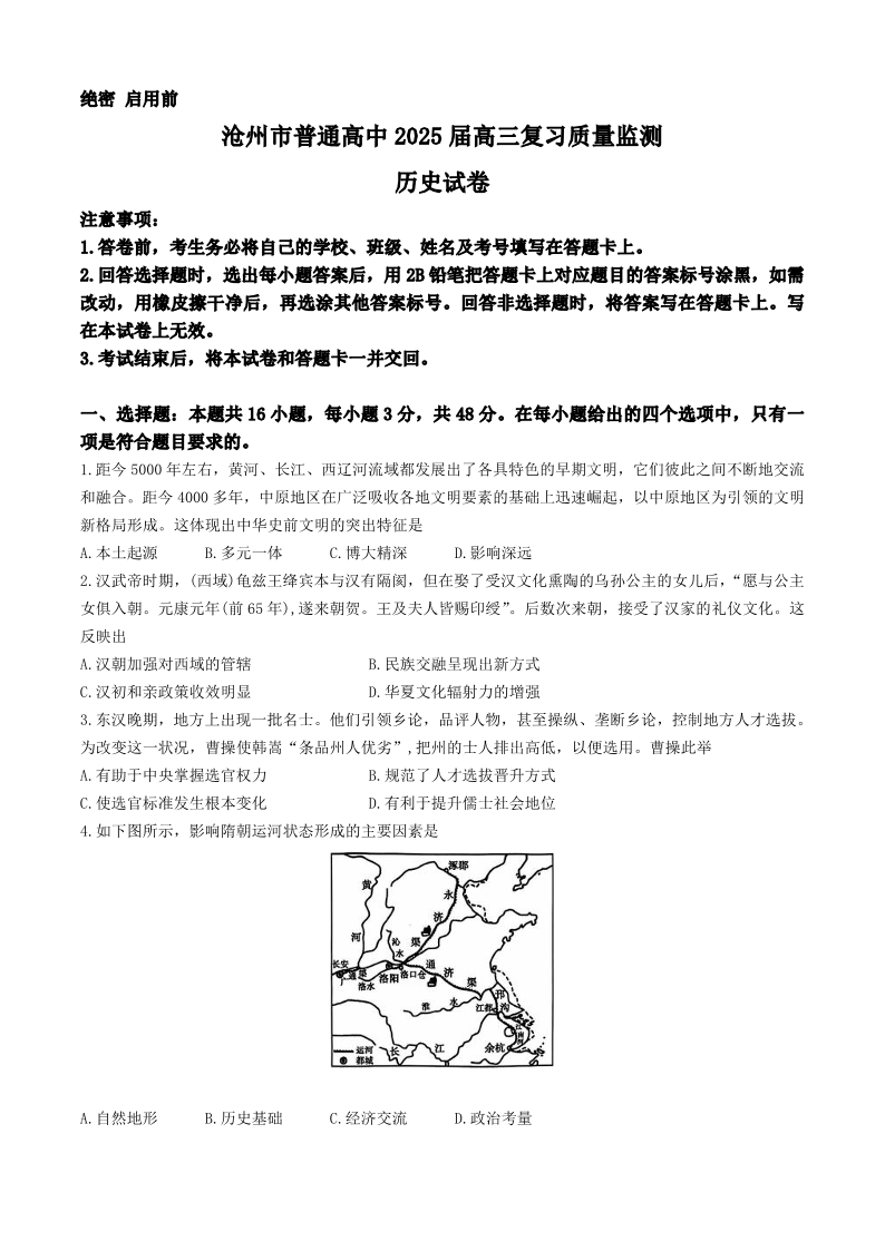 河北省沧州市2025届高三10月复习质量监测 历史