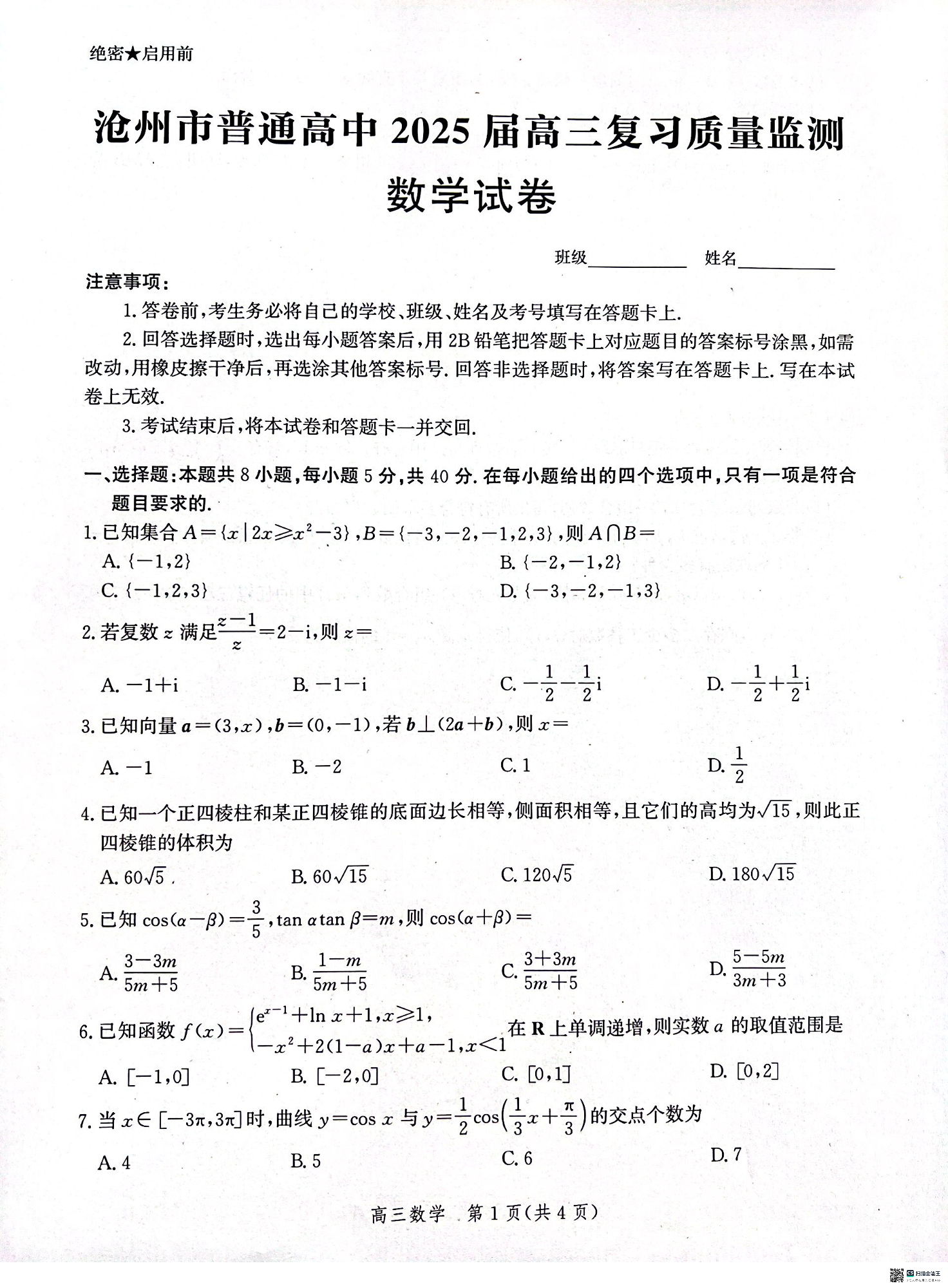 河北省沧州市2025届高三10月复习质量监测 数学
