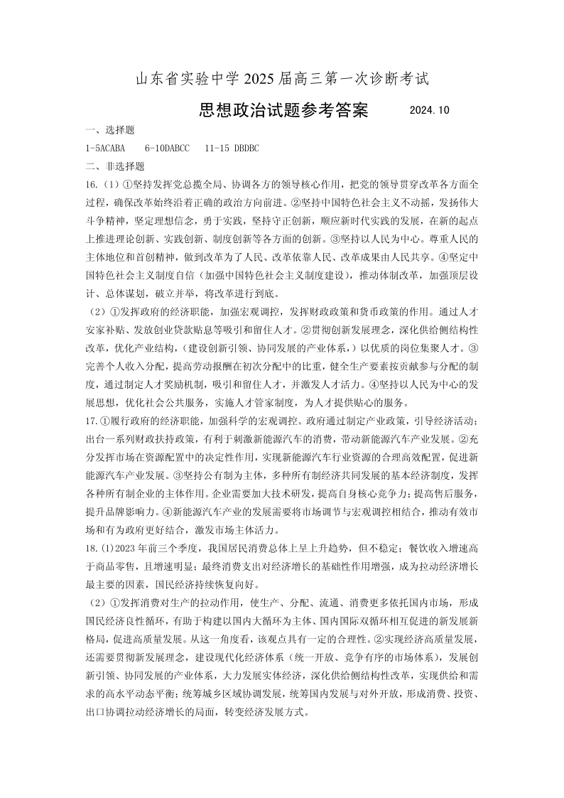 山东省实验中学2025届高三第一次诊断考试 政治答案