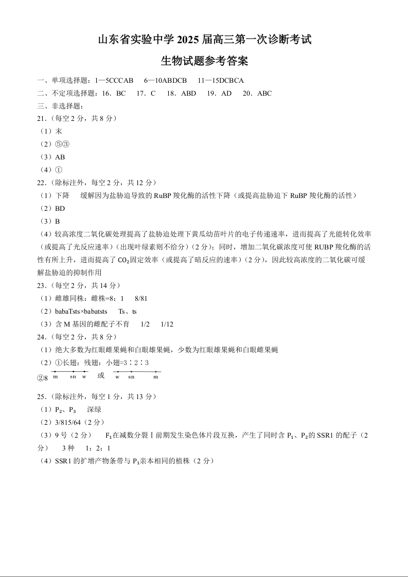 山东省实验中学2025届高三第一次诊断考试 生物答案