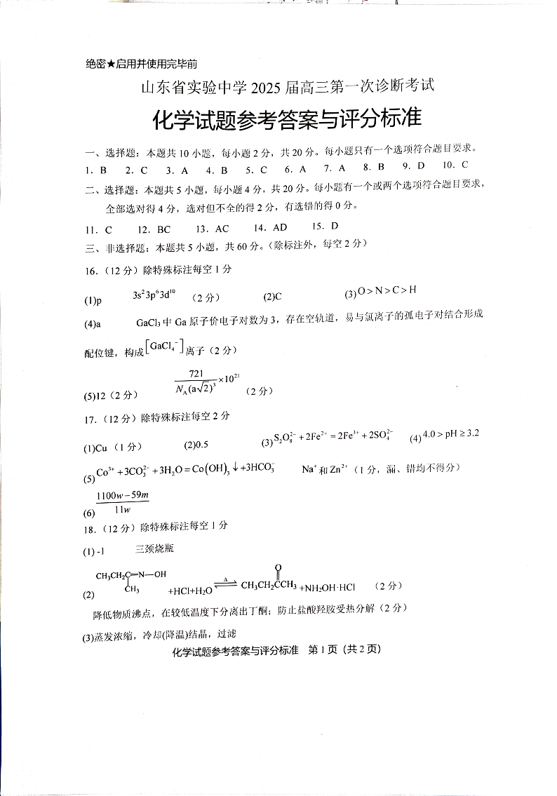 山东省实验中学2025届高三第一次诊断考试 化学答案