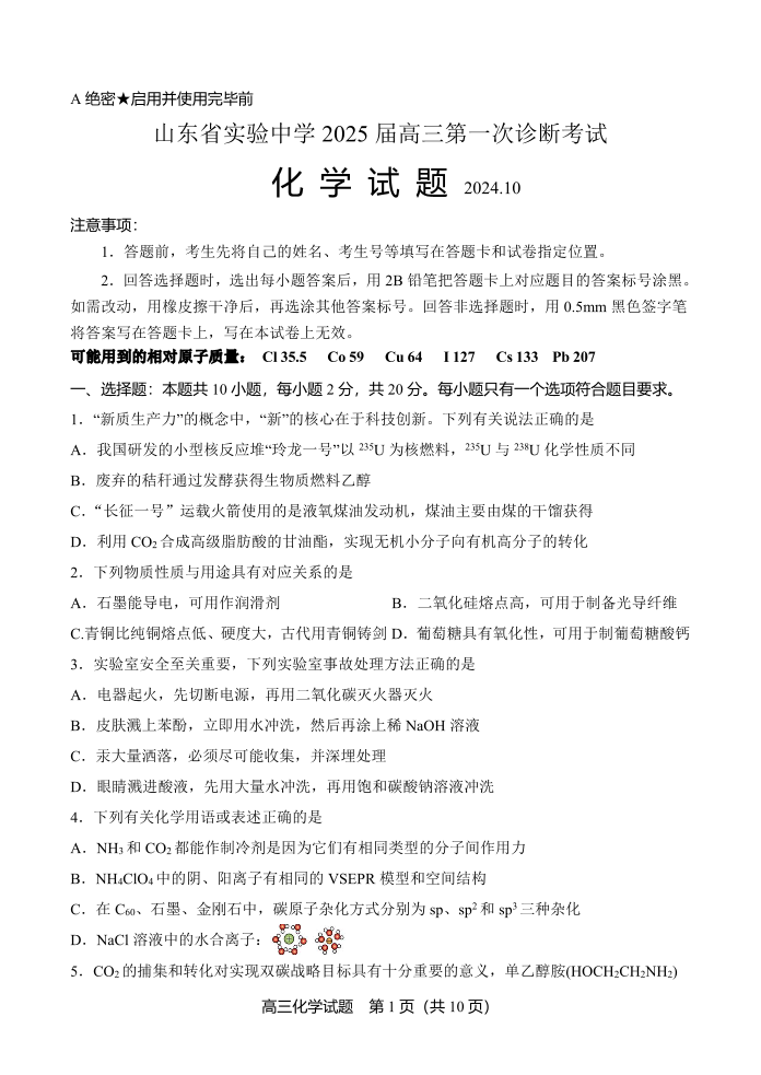 山东省实验中学2025届高三第一次诊断考试 化学