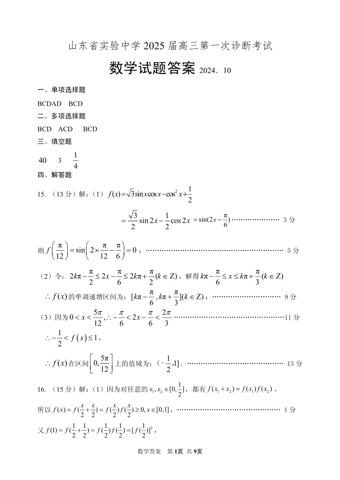 山东省实验中学2025届高三第一次诊断考试 数学答案