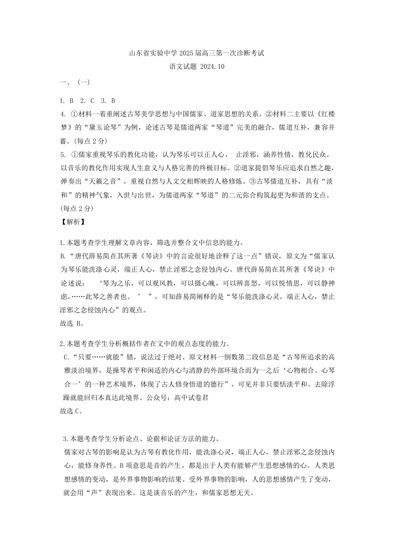 山东省实验中学2025届高三第一次诊断考试 语文答案