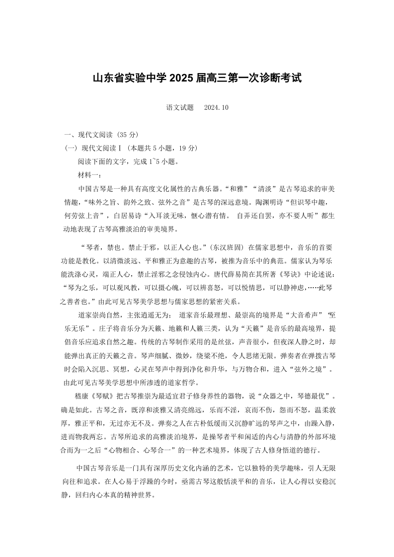 山东省实验中学2025届高三第一次诊断考试 语文
