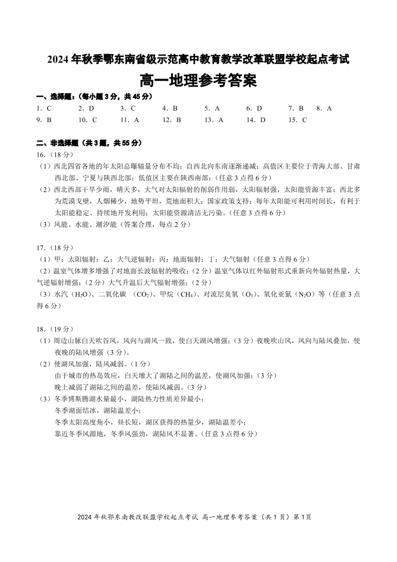 高一地理参考答案