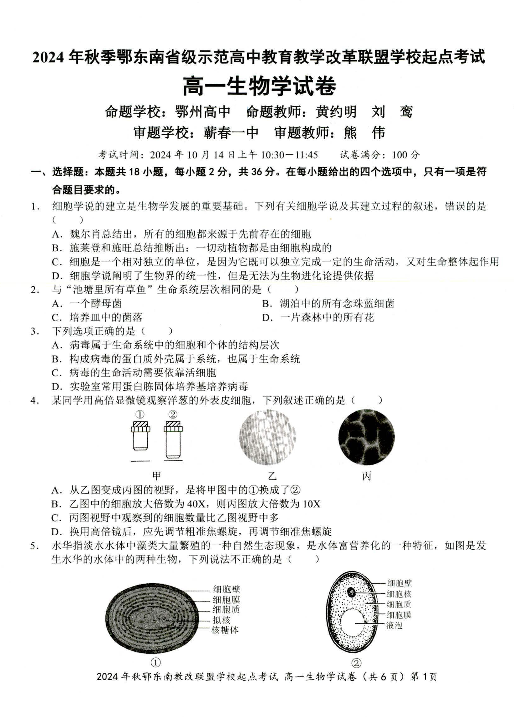 湖北省2024年秋季鄂东南联盟学校高一年级10月起点考试 生物