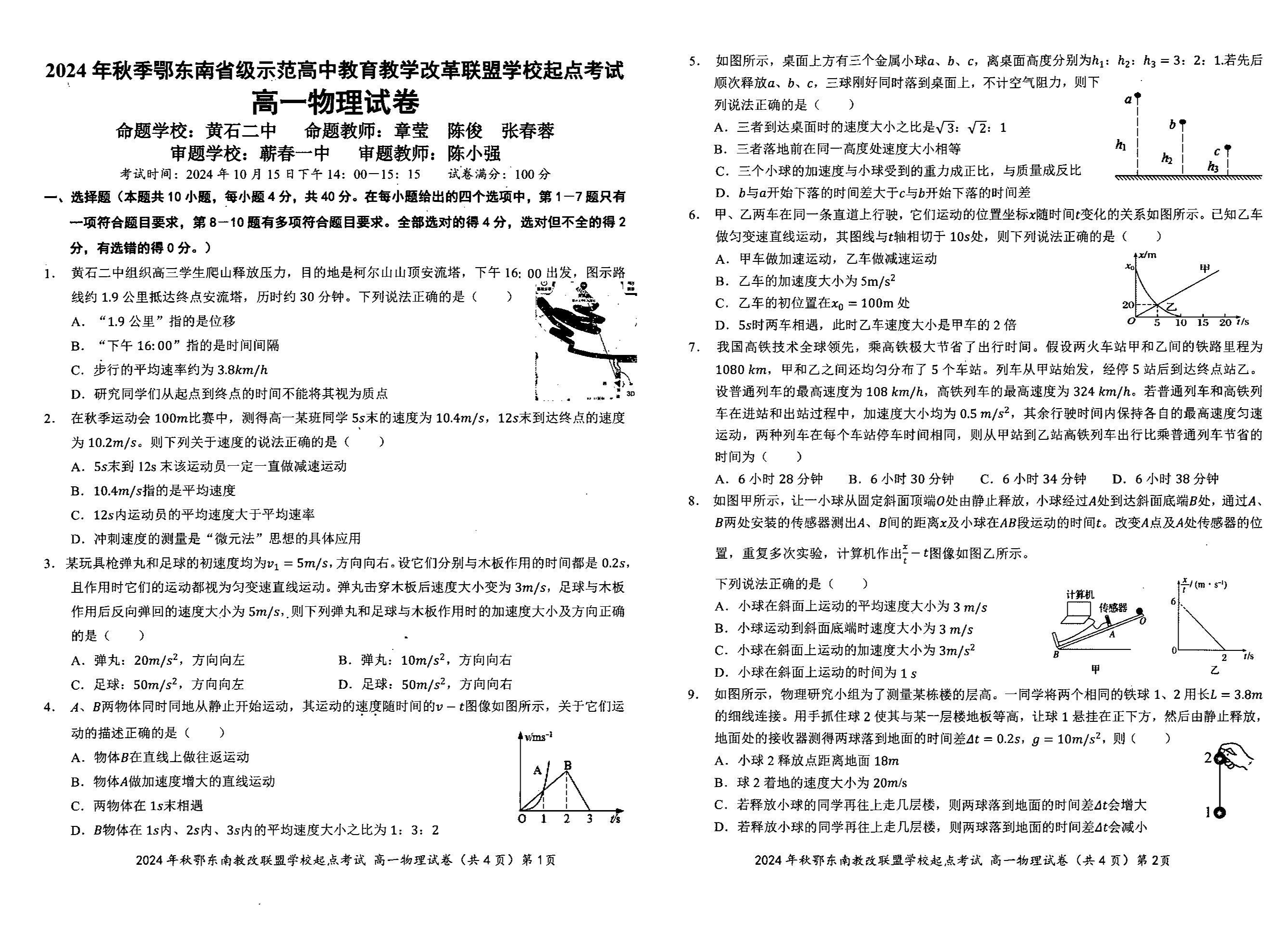 湖北省2024年秋季鄂东南联盟学校高一年级10月起点考试 物理