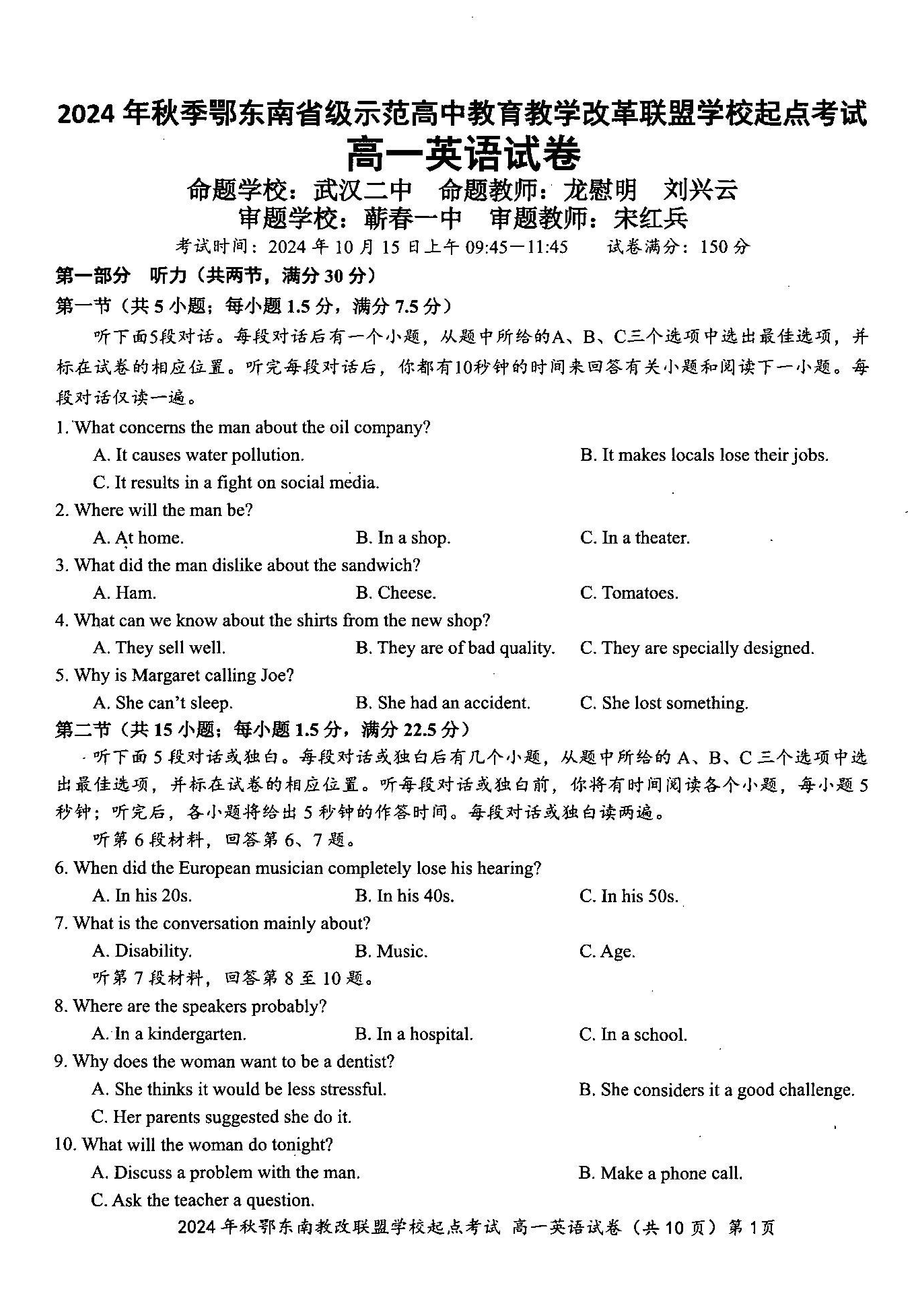 湖北省2024年秋季鄂东南联盟学校高一年级10月起点考试 英语