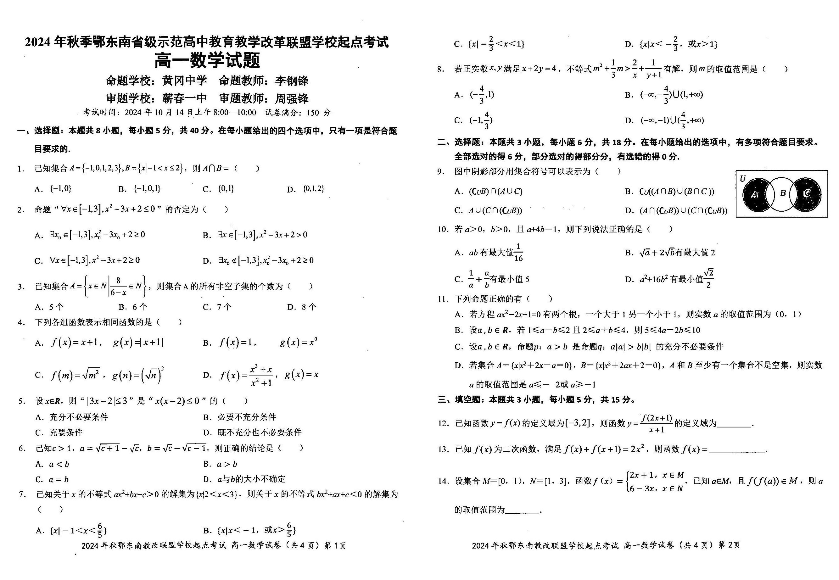 湖北省2024年秋季鄂东南联盟学校高一年级10月起点考试 数学