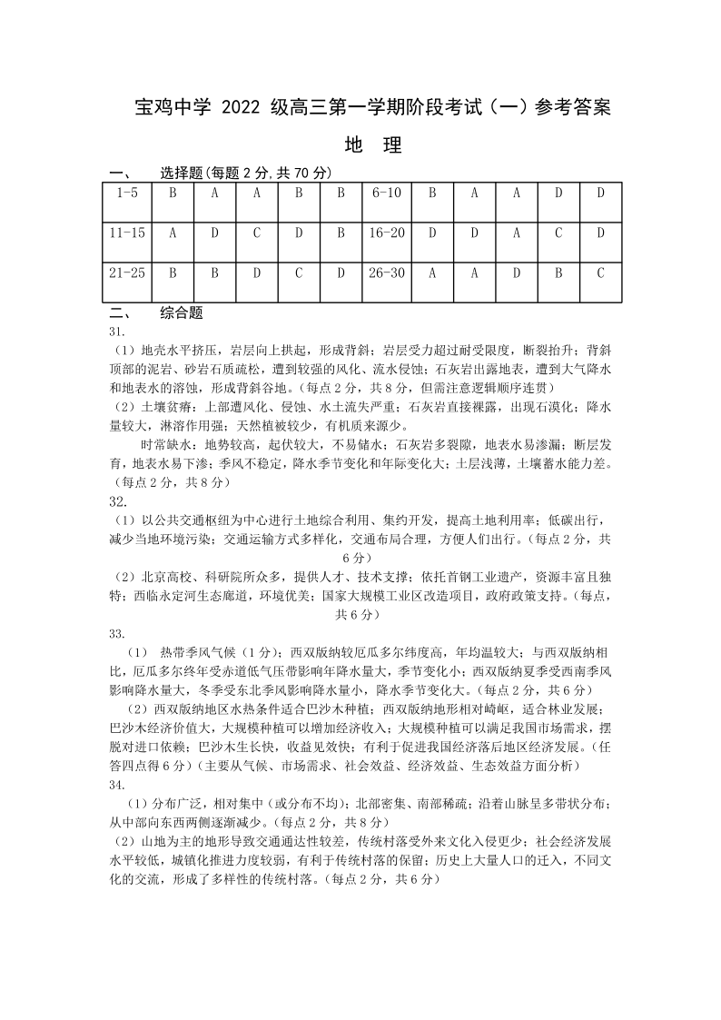 宝鸡中学2022级高三第一学期月考(一)地理答案