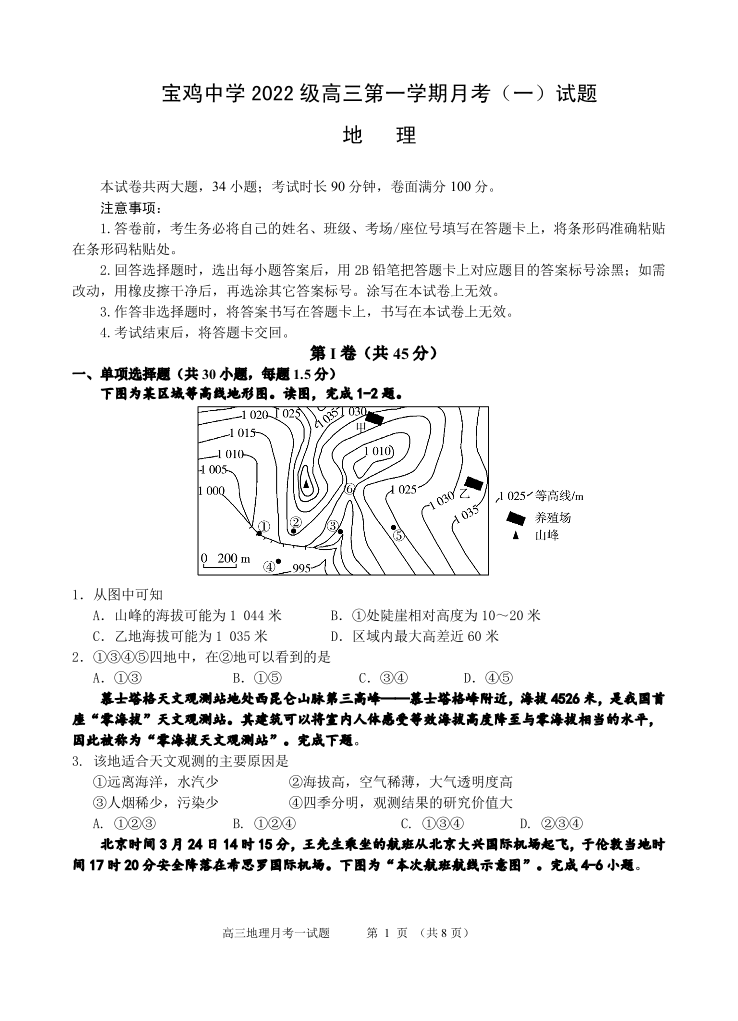 宝鸡中学2022级高三第一学期月考(一)地理