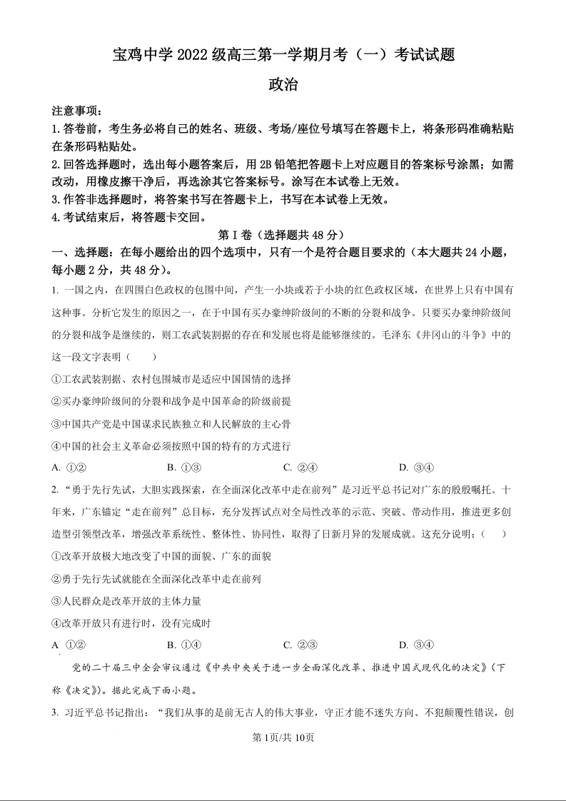 宝鸡中学2022级高三第一学期月考(一)政治