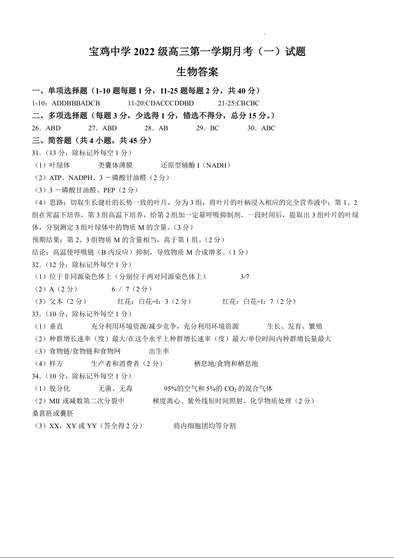 宝鸡中学2022级高三第一学期月考(一)生物答案