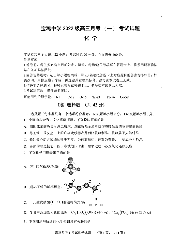 宝鸡中学2022级高三第一学期月考(一)化学
