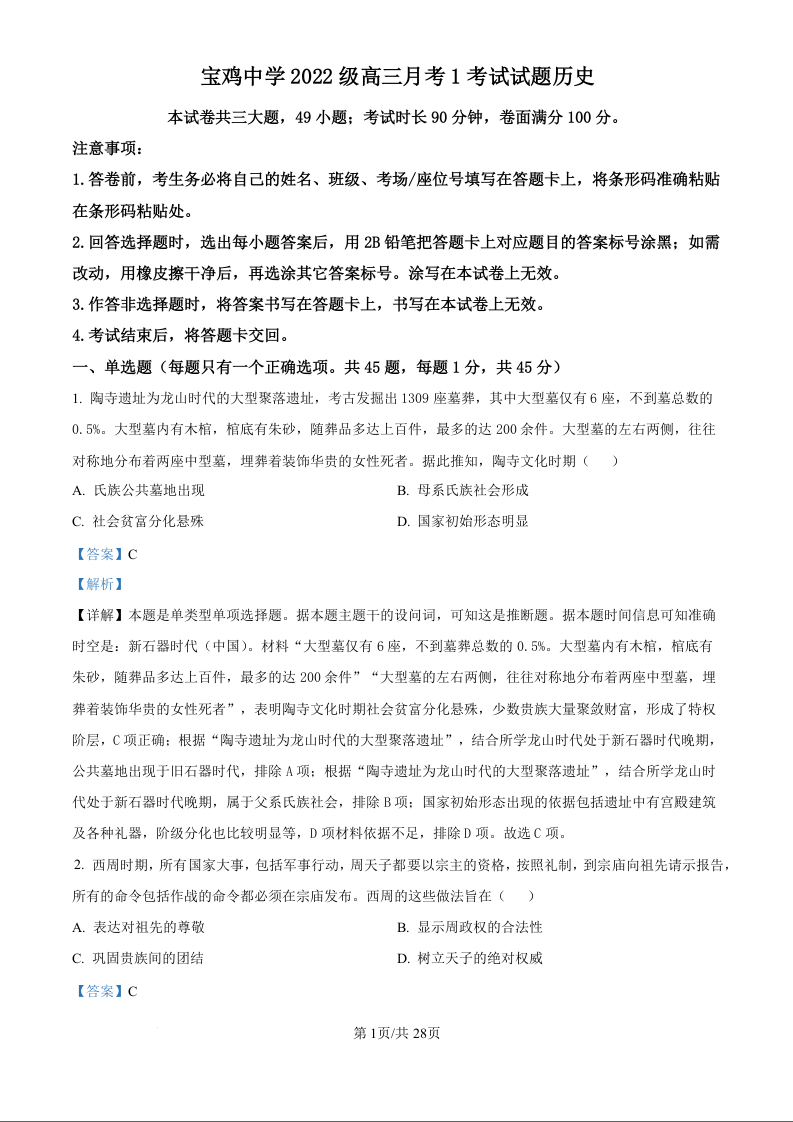 宝鸡中学2022级高三第一学期月考(一)历史答案