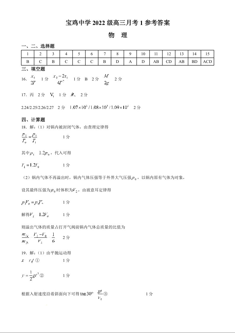 宝鸡中学2022级高三第一学期月考(一)物理答案