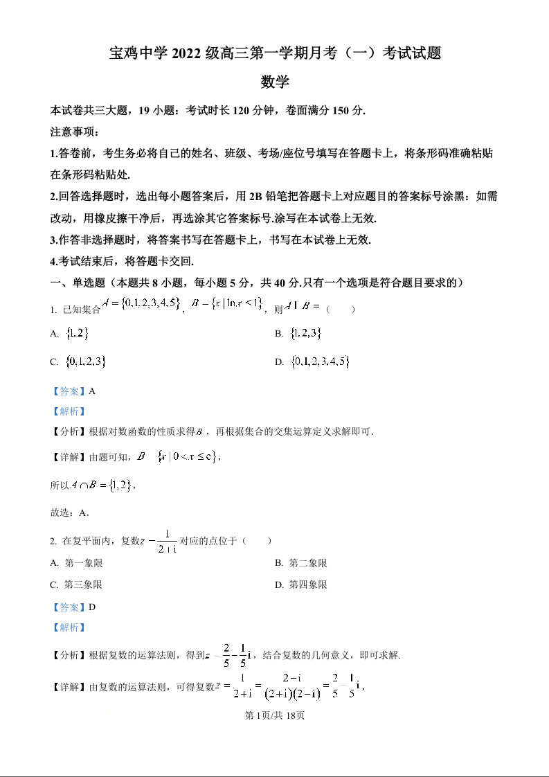 宝鸡中学2022级高三第一学期月考(一)数学答案
