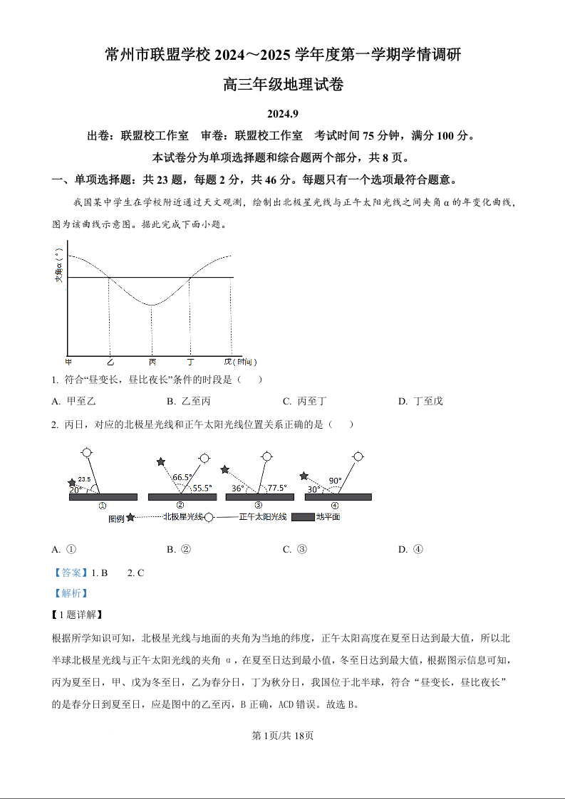 江苏省常州市联盟学校2025届高三上学期10月月考 地理答案